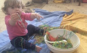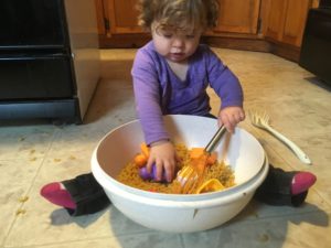 One activity that keeps Alexa busy is a bowl full of uncooked macaroni, throw in a few toys and spoons and she’s usually set for about 20 minutes while I get some dishes done.