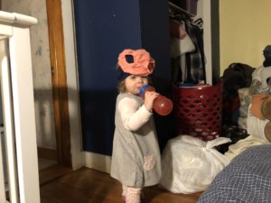 Sometimes she’ll go put her clothes in her basket, and sometimes she walks around the house with them on her head, either way it’s a win win!