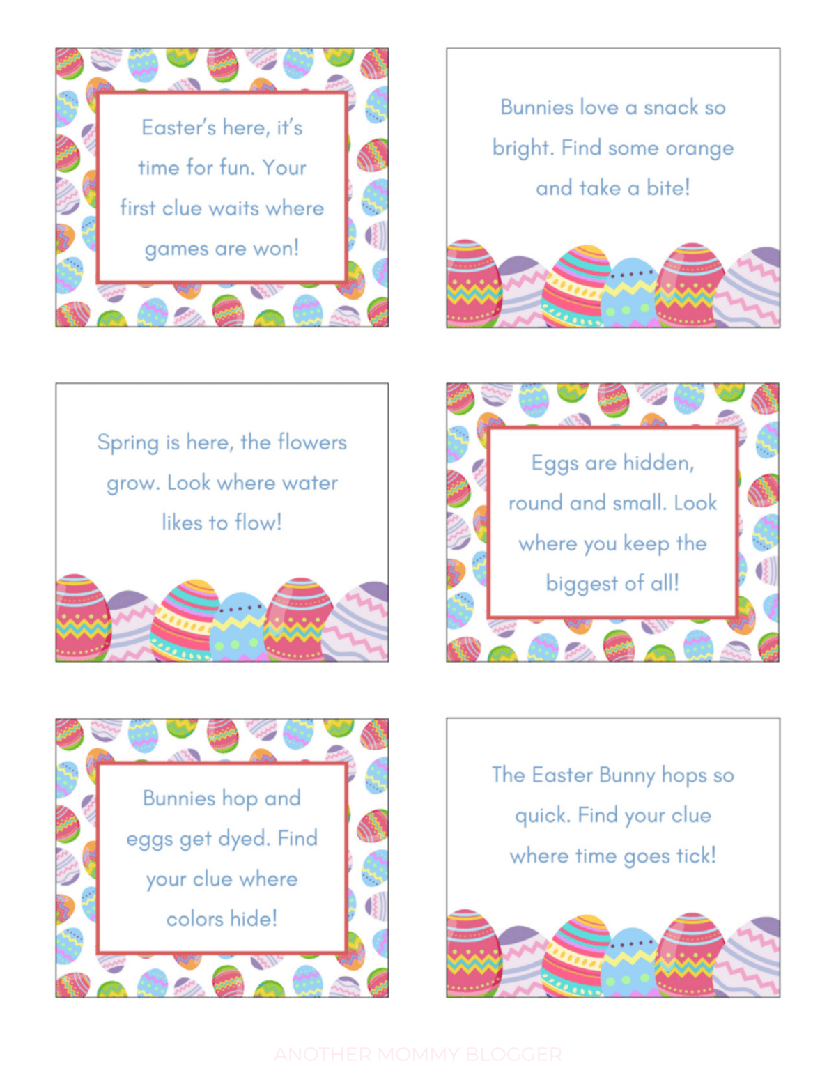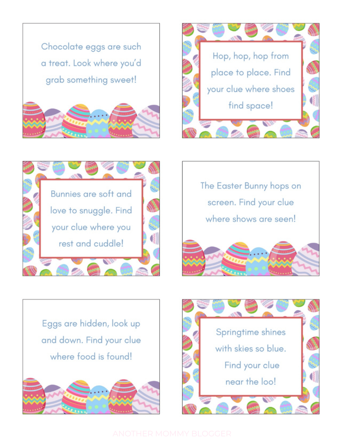 Click the links below to snag my cute printable Easter scavenger hunt clues. You can cut them out and hide them as is or add them to plastic Easter eggs first.
