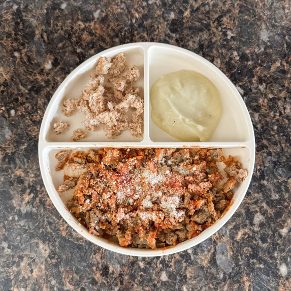 This one came together from our family burrito bowl night! I used brown rice with black beans and corn as the base, and added some shredded chicken and diced avocado on the side. It’s easy to adjust the textures and portions depending on your toddler’s stage.